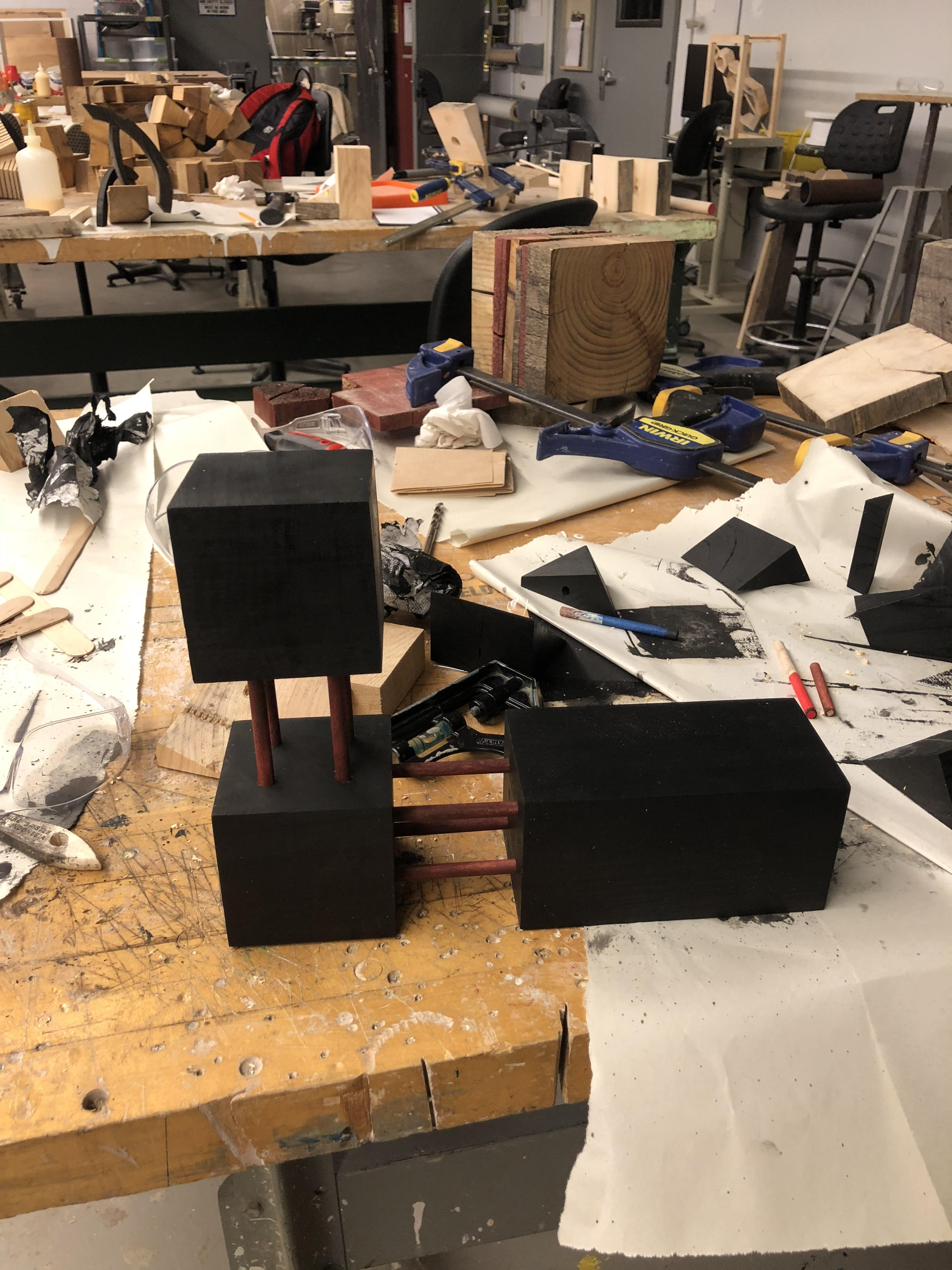 Displacement over time and space disintegrates three equally sized rectangular wood blocks. While the memory of each block is retained through its overall volume, the blocks becomes more fractured and unrecognizable with each step of the process. Exploding upwards, this pieces creates both positive and negative space with its form.